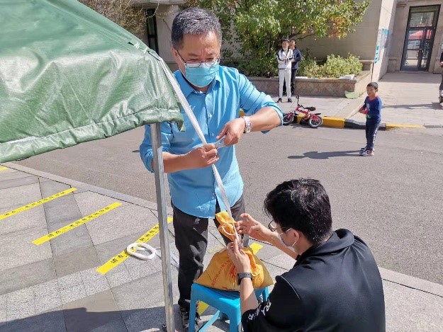 在全員核酸檢測時,工力所社區居民多已年長,部分人員身體狀況不佳,長時間排隊情緒容易焦躁,體力也吃不消。對此,現場工作組積極協調,第一時間為社區提供塑料座椅,供居民臨時休息。現場工作人員長時間指揮嗓子干啞,支部立即調配擴音器、引導線等,輔助維持現場秩序。聞息近期有雨,又緊急增配雨衣,以免影響檢測工作。接到第四輪核酸檢測點遷移指令后,工作組又緊急集結,在居民區空地搭設帳篷,設置排隊引導線、隔離樁,調試設備設施,有效保證核酸檢測工作順利進行。