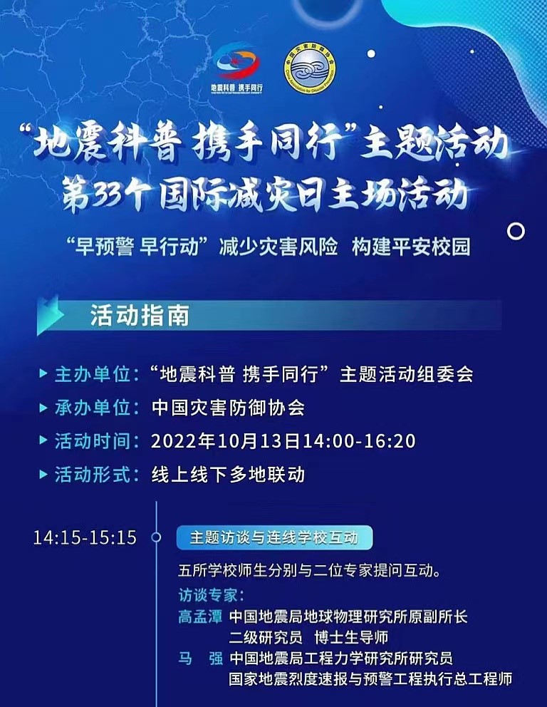 一是我所馬強研究員受邀參加中國災(zāi)害防御協(xié)會組織的“地震科普 攜手同行”主題直播活動。線上訪談期間,馬強研究員就怎樣獲得預(yù)警信號,接收預(yù)警信號后如何做;如何減輕地震風(fēng)險,建設(shè)更安全校園;山區(qū)學(xué)校師生如何開展應(yīng)急避險;高樓避險有何不同等社會關(guān)切問題進行了細致解答,各平臺直播和回放總量已超800萬次。