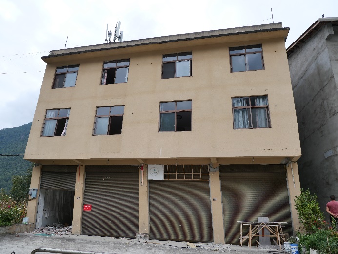 瀘定線科考組(曲哲、朱柏潔)主要考察了位于八度和九度區(qū)的磨西鎮(zhèn)典型建筑地震損傷情況,包括典型的隔振結(jié)構(gòu)、木結(jié)構(gòu)、底框結(jié)構(gòu)等。如甘孜某學(xué)校行政樓,為框架結(jié)構(gòu)底部隔震建筑,采用隔震支座附加油阻尼器的設(shè)計(jì),在地震中上部結(jié)構(gòu)整體發(fā)生了平移,底部隔震層位移明顯,震后隔震支座完好,部分阻尼器損傷。杉樹(shù)鎮(zhèn)的底框結(jié)構(gòu),典型破壞特征為首層柱傾斜,上部磚墻交叉裂縫,一些非結(jié)構(gòu)構(gòu)件發(fā)生破壞。部分砌體結(jié)構(gòu)建設(shè)在山坡上,基礎(chǔ)局部失效,使得上部結(jié)構(gòu)震害較重。同時(shí)瀘定線科考組還前往燕子溝地震臺(tái),查看了儀器情況。