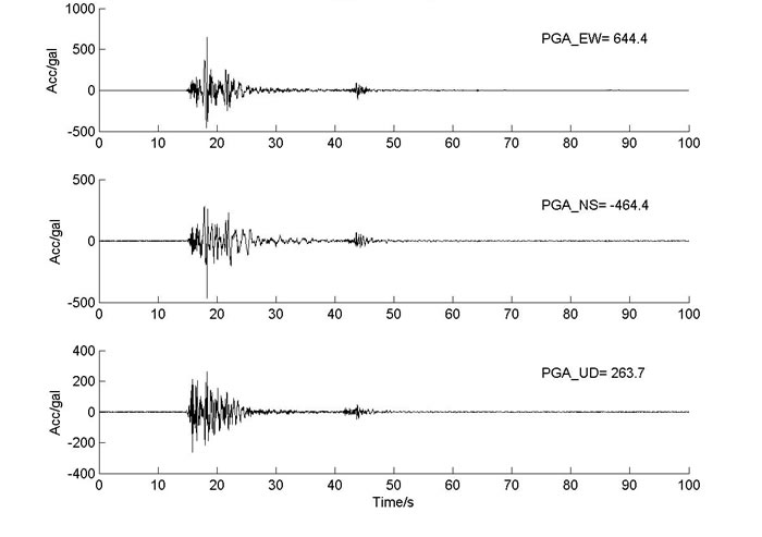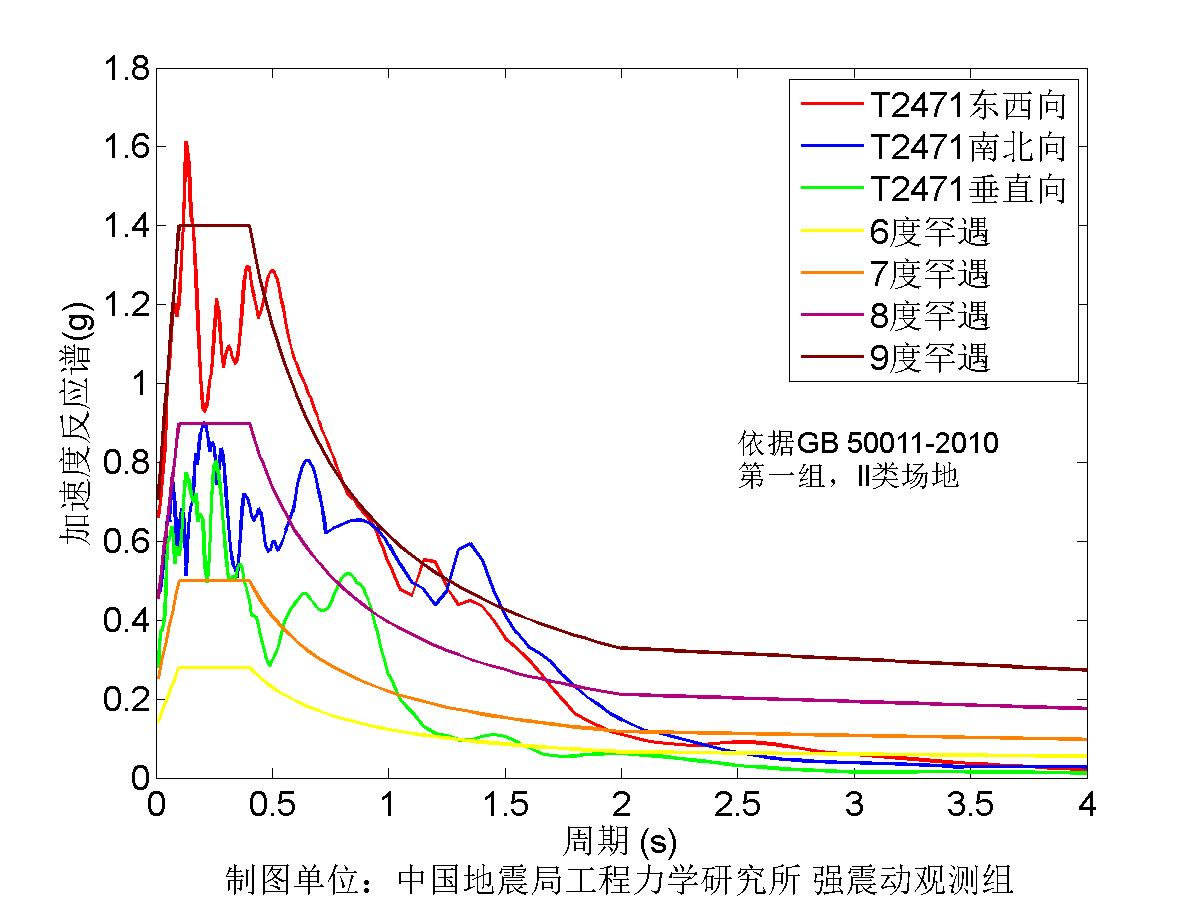 此次獲取的記錄,距離震中最近的51LDJ臺(tái)震中距16.2公里,東西向峰值加速度超過(guò)0.32個(gè)重力加速度,儀器地震烈度8.7度,T2471臺(tái)震中距為28.3km,東西峰值加速度超過(guò)0.64個(gè)重力加速度,儀器地震烈度9.1度。