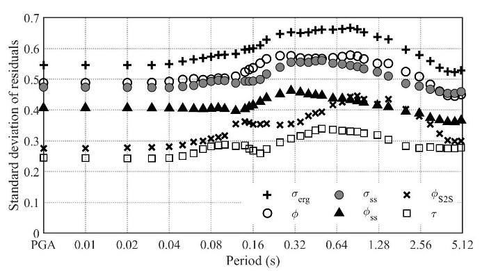 (2)單臺標(biāo)準(zhǔn)差的計(jì)算結(jié)果表明(見圖2),本研究區(qū)域的部分非遍歷假設(shè)較遍歷性假設(shè)的標(biāo)準(zhǔn)差減少了10% - 20%。事件修正后的單臺標(biāo)準(zhǔn)差φss值范圍在0.36-0.47,整體低于大部分陸地地區(qū)研究結(jié)果(0.4-0.5),表明海域地區(qū)的傳播介質(zhì)引起的地震動不確定性相比于陸地區(qū)域更小,海域區(qū)域性差異沒有陸地顯著。