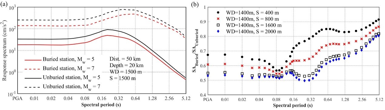 圖4 本研究中海底臺站埋設(shè)和未埋設(shè)對反應(yīng)譜值影響對比