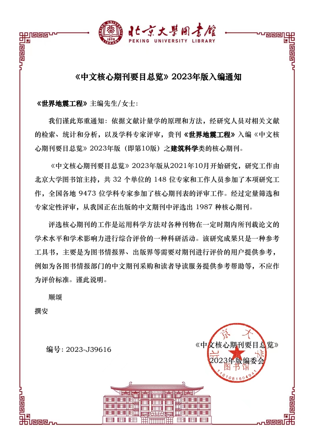 近日,接《中文核心期刊要目總覽》2023年版編委會通知,我所主辦的三本中文刊《自然災害學報》《地震工程與工程振動》《世界地震工程》再次入編《中文核心期刊要目總覽》。依據文獻計量學的原理和方法,經研究人員對相關文獻的檢索、統計和分析,以及學科專家評審,《自然災害學報》入編“環境科學”類核心期刊,《地震工程與工程振動》《世界地震工程》入編“建筑科學”類核心期刊。