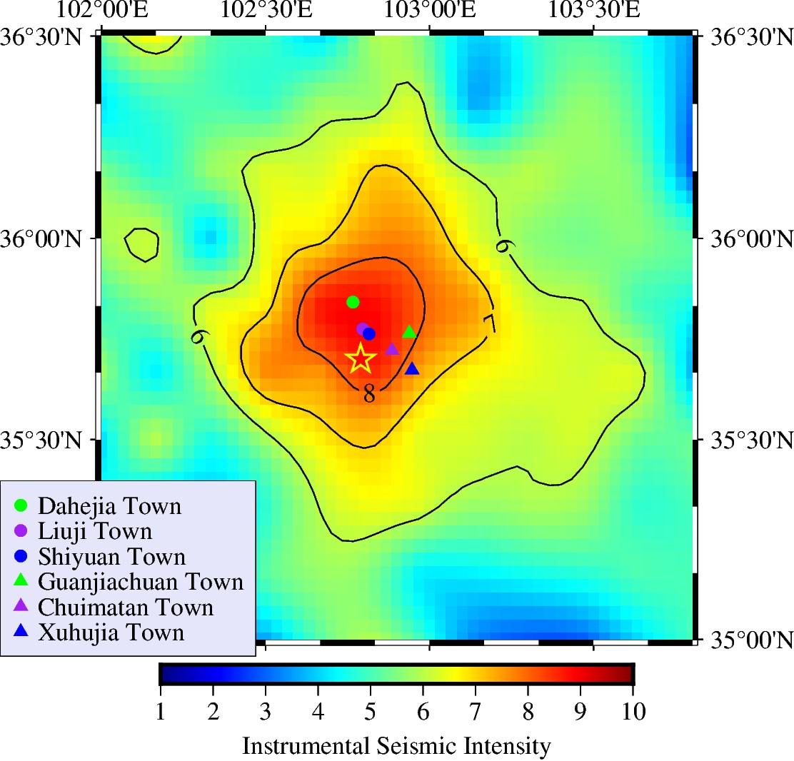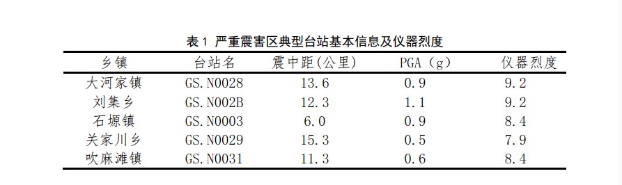 根據現場調查情況,大河家鎮、劉集鄉、石塬鎮、關家川鄉、吹麻灘鎮等鄉鎮震害嚴重。對此,我們對以上鄉鎮附近的強震動記錄進行了分析。首先,由儀器烈度分布圖(如圖7)可知,上述鄉鎮均位于高儀器地震烈度區(見表1)。