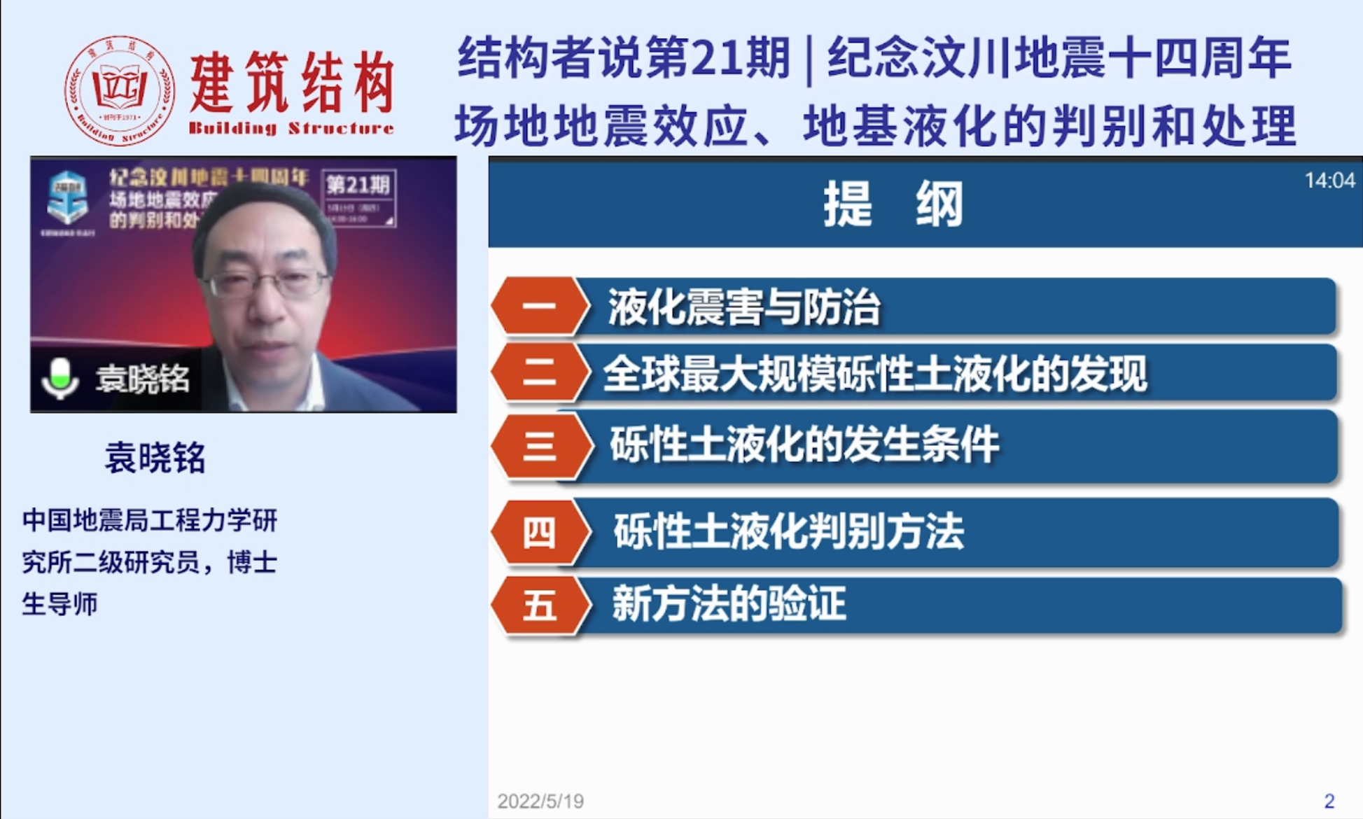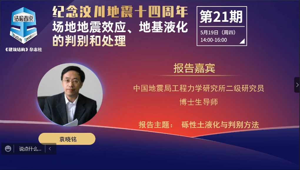 發布時間: 2022-05-24 點擊數量:7410袁曉銘研究員的報告中,介紹了2008年汶川大地震中發生的全球最大規模的礫性土液化及震害現象,解釋了礫性土液化的機理和觸發條件;介紹了具有中國特色的礫性土液化判別方法以及通過國際合作對新方法的驗證結果。報告面向一線工程技術人員,采用深入淺出的方式進行講解,受到工程技術人員的歡迎。報告后的互動提問環節,袁曉銘研究員在線回答了聽眾提出的關于“學校和醫院提高一度進行液化設防的必要性”、“礫性土和砂土液化判別方法的差別”、“不液化和不考慮液化概念的區別”等一系列問題。