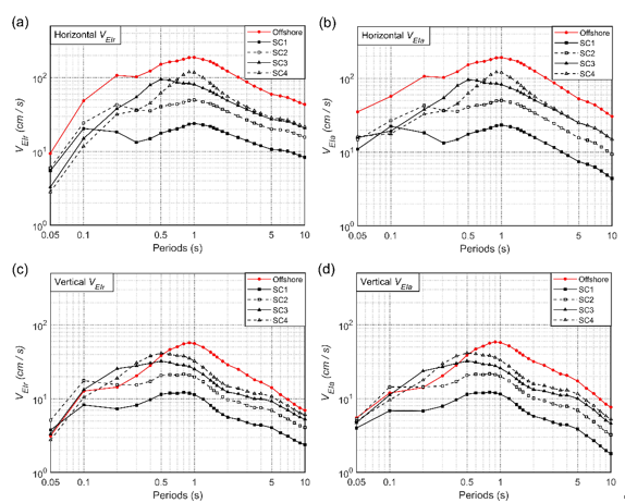 1) 從海/陸地震動場地條件差異的角度探討建立了日本相模灣海域的海底地震動輸入能量的水平和豎向衰減模型,通過隨機效應模型回歸分析,在海底地震動輸入能量譜的衰減模型中考慮震級、震源距、震源深度、地震類型以及海底臺站場地效應等的綜合影響,給出了海底和陸地地震動在彈性輸入能量譜上的差異。海/陸地震動衰減特征對比表明,海底水平向地震動輸入能量明顯大于同級別的陸地地震動;海底豎向地震動輸入能量在短周期小于陸地地震動,但在長周期大于陸地地震動(見圖2)。