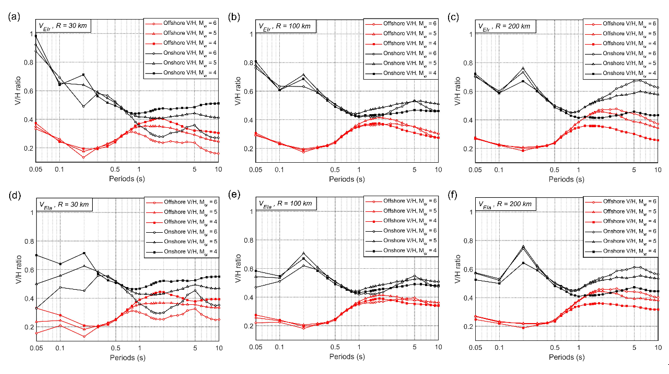 2)為了深入分析海/陸地震動輸入能量在水平與豎向的差異,分析了海底V/H輸入能量譜比,并與陸地地震動比較。結果表明,海底V/H輸入能量譜比與陸域譜比在震級、距離和周期等方面都存在較大差異,海底地震動的V/H輸入能量譜比在短周期均明顯小于陸地地震動,同時海底臺站間的V/H輸入能量譜比也存在較大的差異(見圖3)。